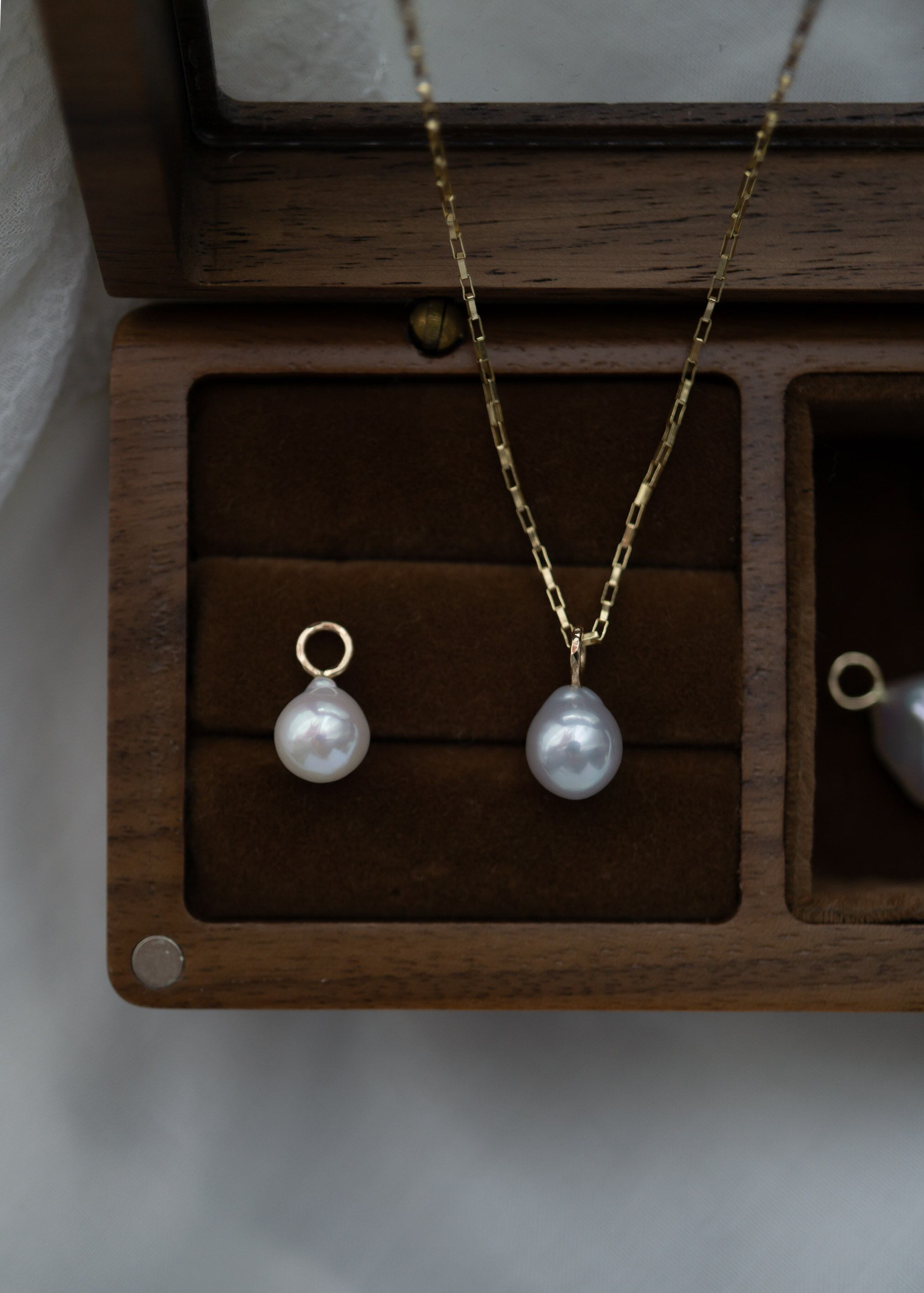 それらは人工物でないからこそのパールらしい魅力と考え、風合いを活かしてお一つずつ仕立てております。